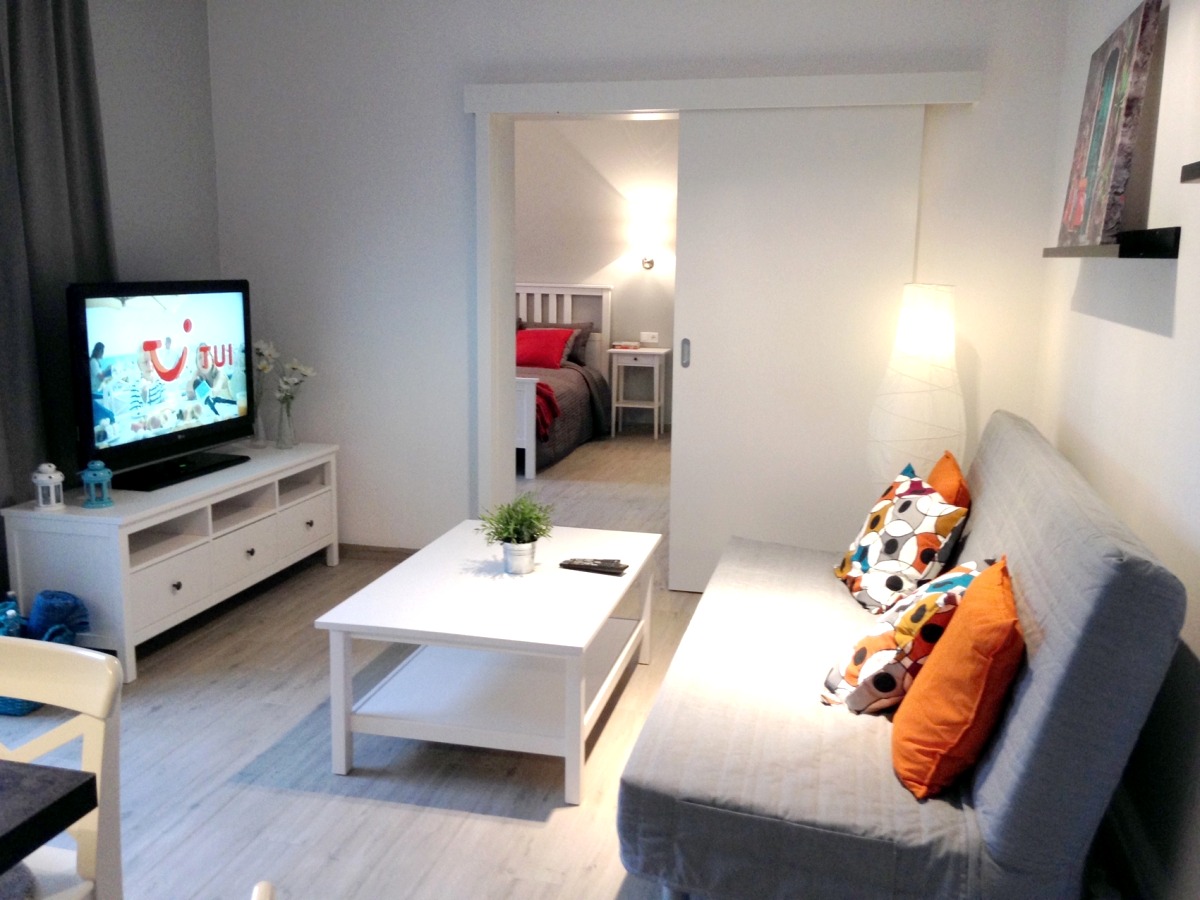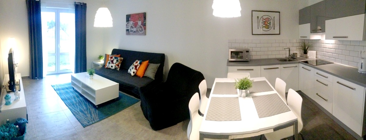 Przestronny salon z aneksem kuchennym i częścią jadalnianą oraz duża sypialnia z szerokim łóżkiem i rozkładaną sofą. Apartament jest pięknie nasłoneczniony i ma dwa duże balkony.